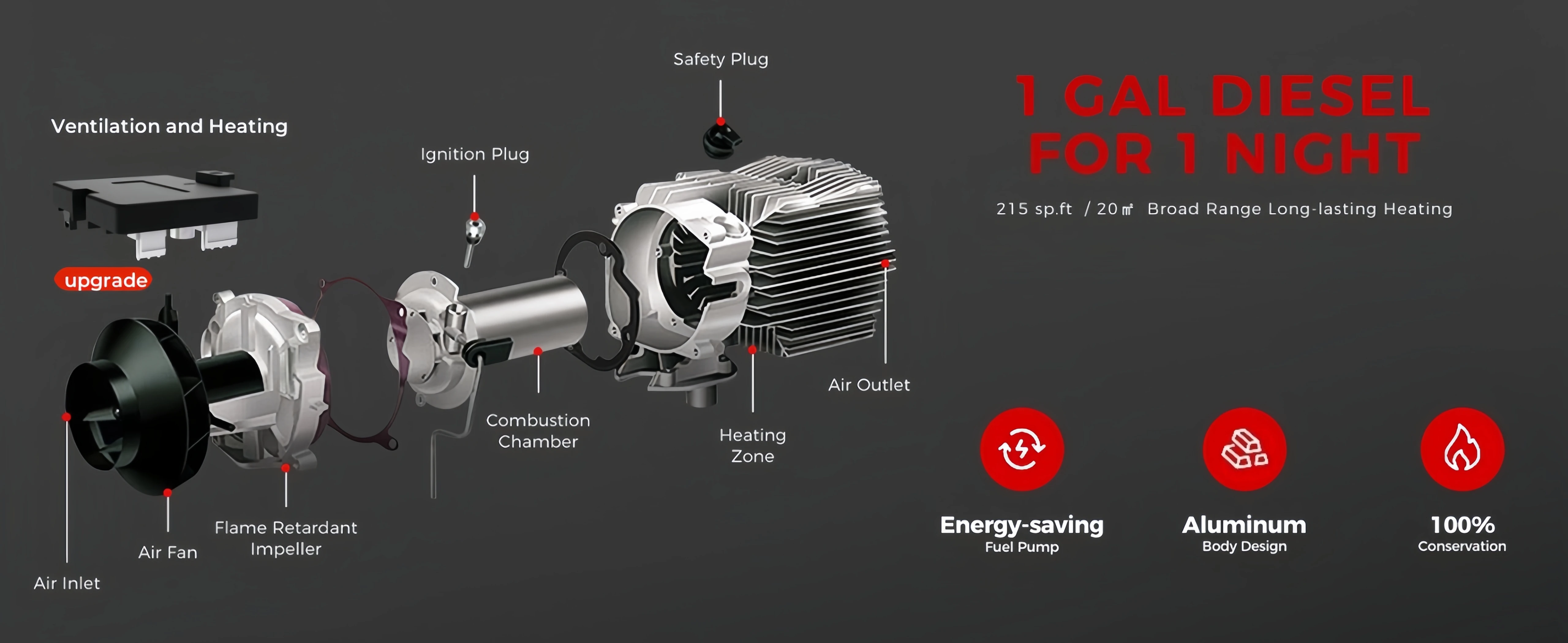 Low fuel consumption&Smart fuel saving:Fuel Consumption: 0.1-0.26 (L/H); Fuel Gasoline: Diesel Only. The diesel heater features an oil pump that precisely controls the fuel inlet for thorough combustion, saving energy while working smoothly. A full 10L/2.6 gal fuel tank will power your heater for up to 100 hours, ensuring low emissions and long-term running