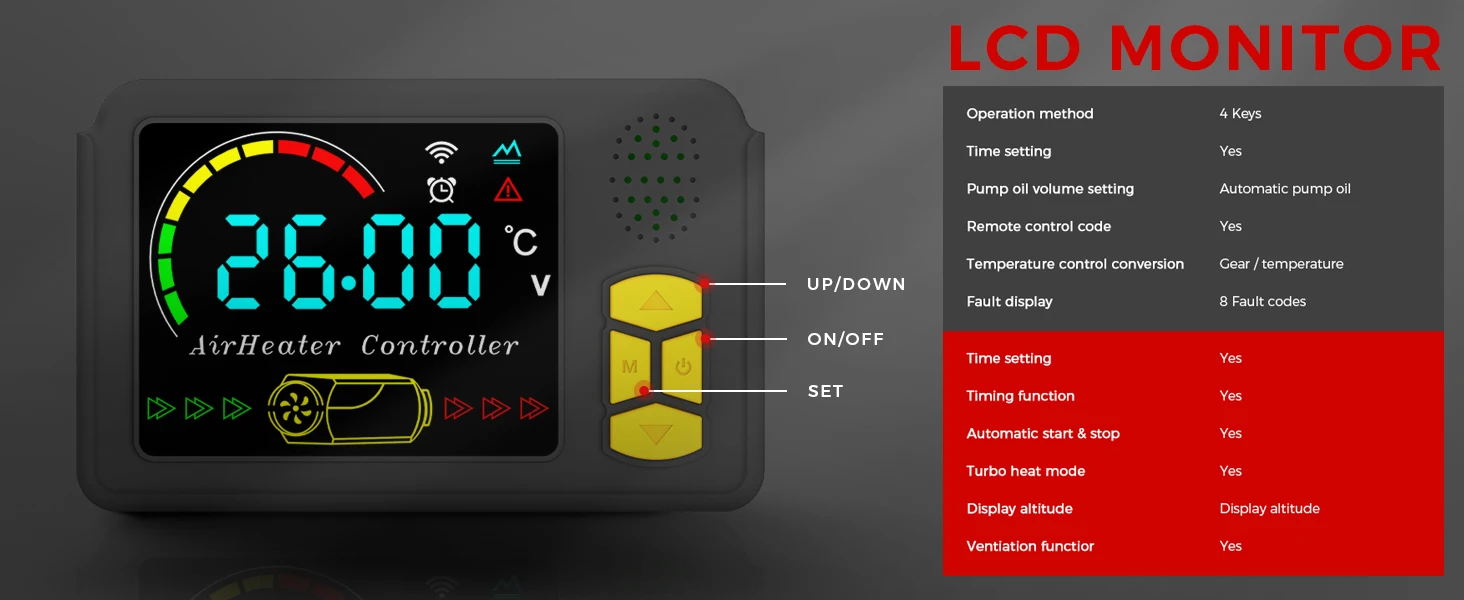 Three Control Methods:Our upgraded diesel heater comes with Bluetooth control, you cancontrol the heater to preheat or regulate the temperature within a distance of 98 feet/30 metersby simply downloading the app. lt also comes with a remote control and LCD display so you canchoose the control that's right for you. The temperature adjustment range is 46 °F-96.8 °F/8 °C-36C to meet your different needs.