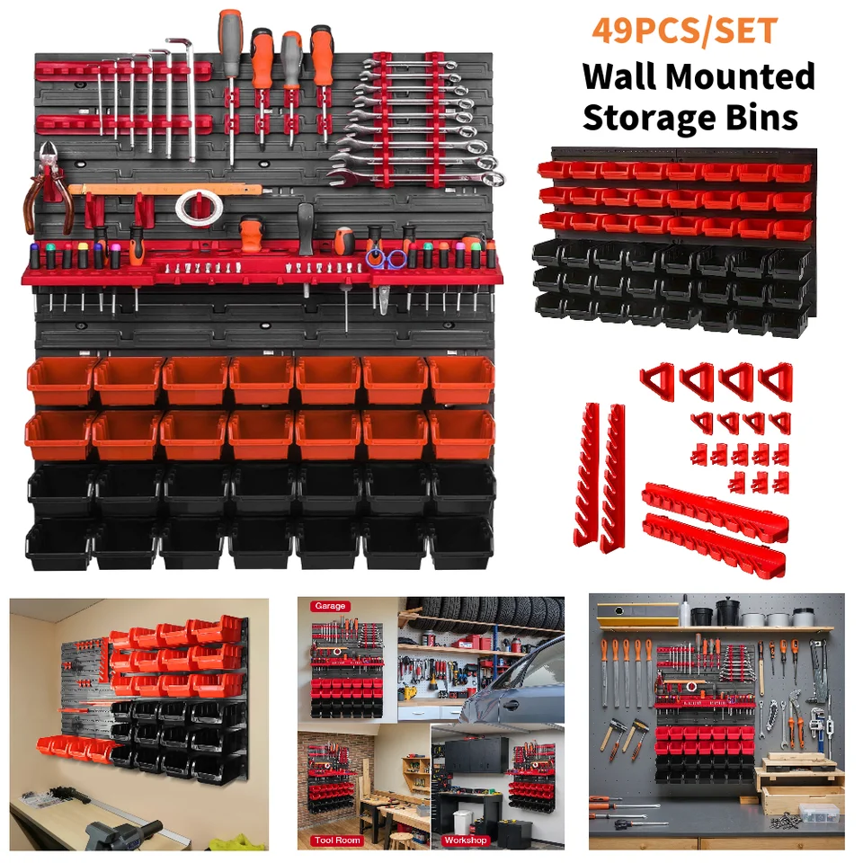 2. Wall-Mounted Storage Bins: Equipped with two scraper panels 49 nut and bolt organizers, this tool holder is perfect for storing various hardware parts and accessories, such as screws, nails, beads, and other small hardware items, keeping your workspace tidy.