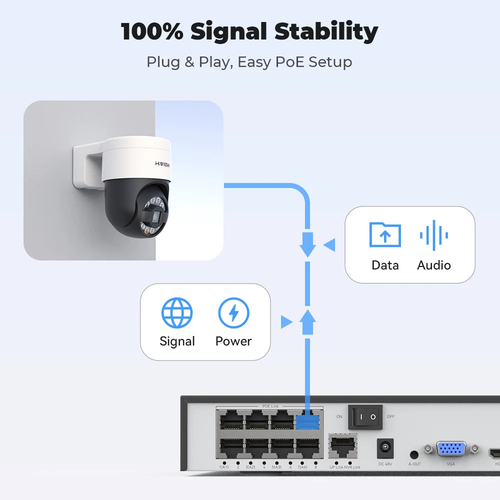 With a Plug-and-Play reliable connection, this PoE camera uses a single Ethernet cable to transmit both data and power. Built-in microphone and speaker for real-time voice intercom.