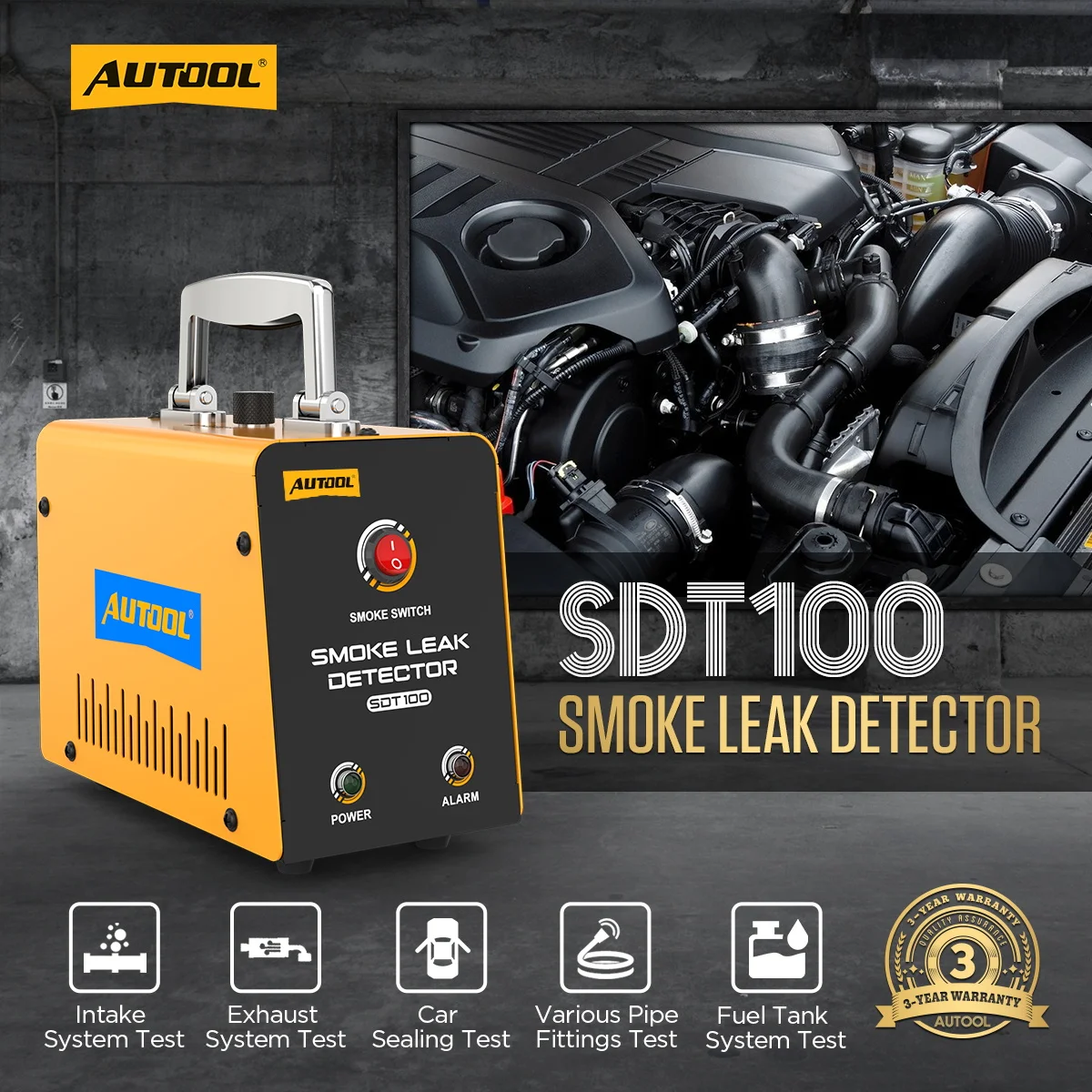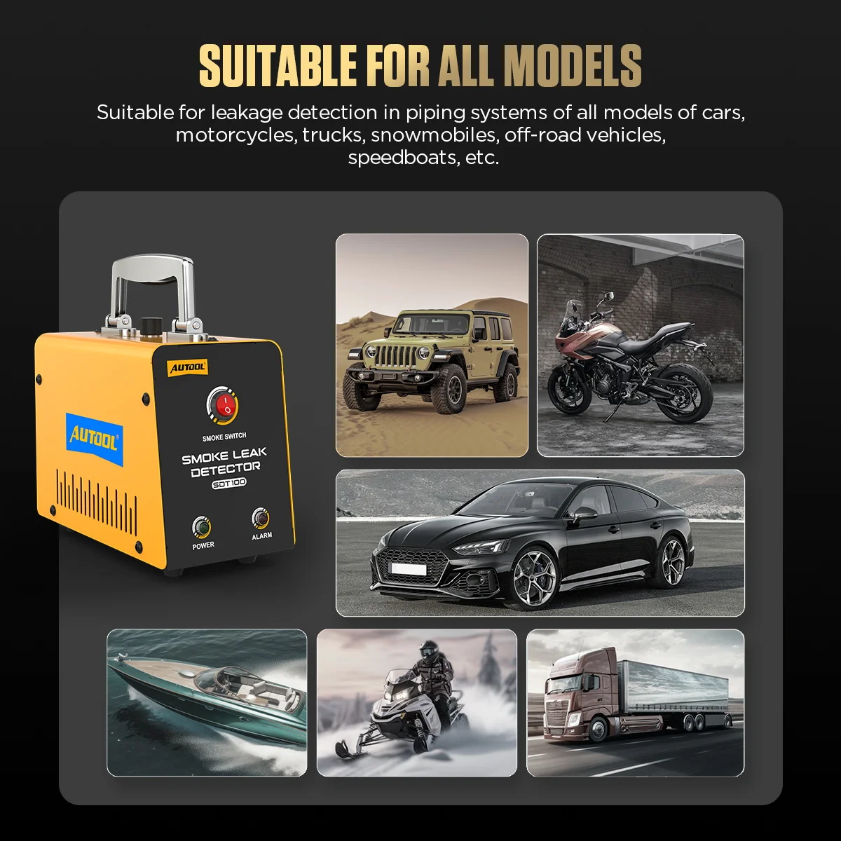 The SDT100 Smoke Leak Detector is specifically designed for detecting leaks in vehicle air and fuel systems. It is suitable for all cars, motorcycles, snowmobiles, off-road vehicles, dune buggies, light trucks, and speedboats. When used in conjunction with a diagnostic tool, it can quickly diagnose engine faults in vehicles.